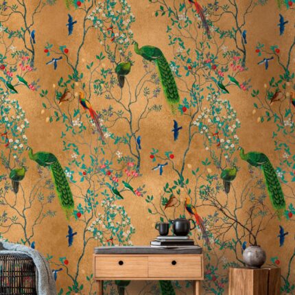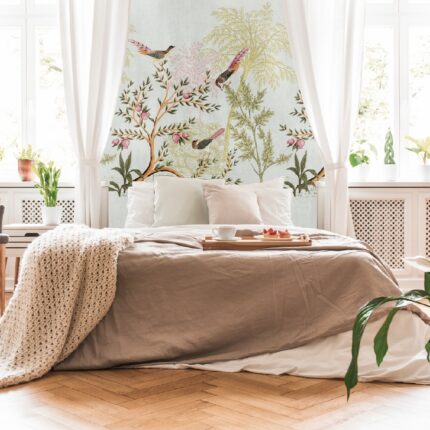 Carta da parato disegno piante con uccelli. Parato vinilico su supporto in TNT. Adatto a camere e soggiorni.