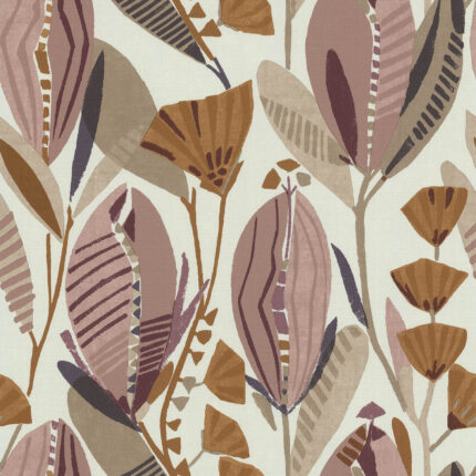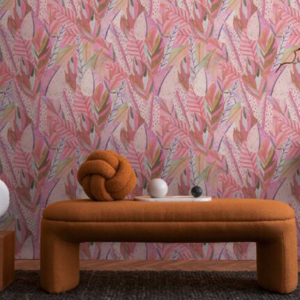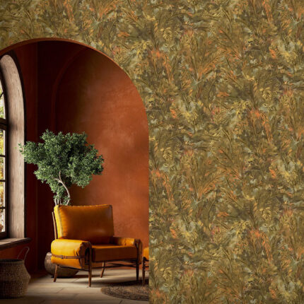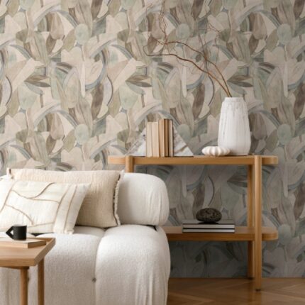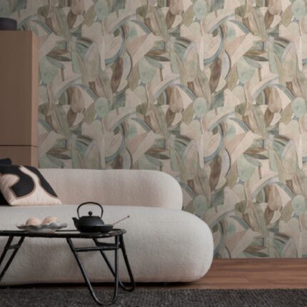 Carta da parato foglie su trama effetto tessuto. Stile contemporaneo e moderno per tutte le tipologie di ambienti.
