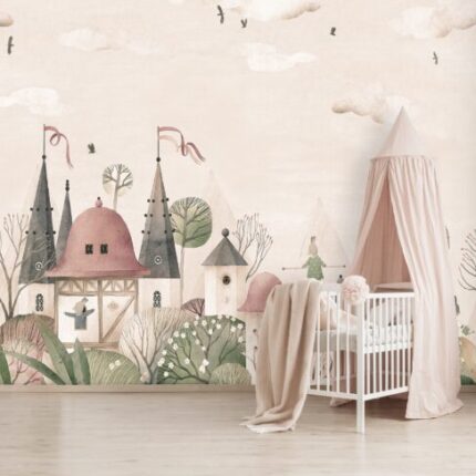 Carta da parato disegno castello incantato. Parato vinilico su supporto in TNT. Adatto a camere neonati ed infanti.