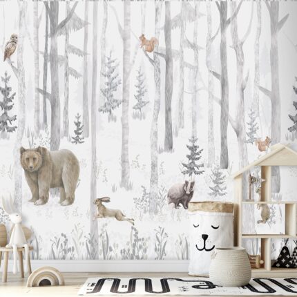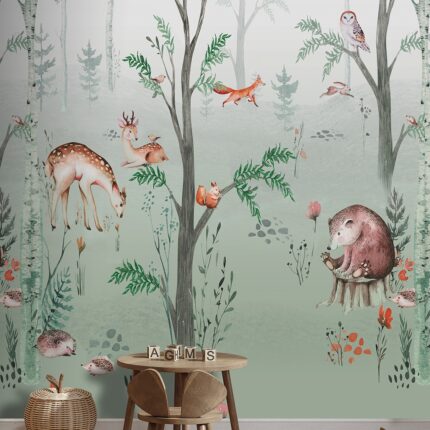 Carta da parato disegno bosco con animali. Parato vinilico su supporto in TNT. Adatto a camere neonati e bambini.