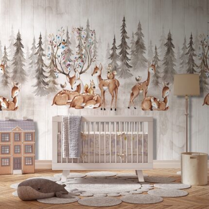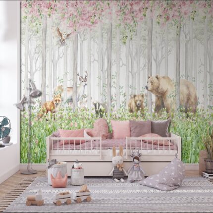 Carta da parato disegno bosco con animali. Parato vinilico su supporto in TNT. Adatto a camere neonati ed infanti.