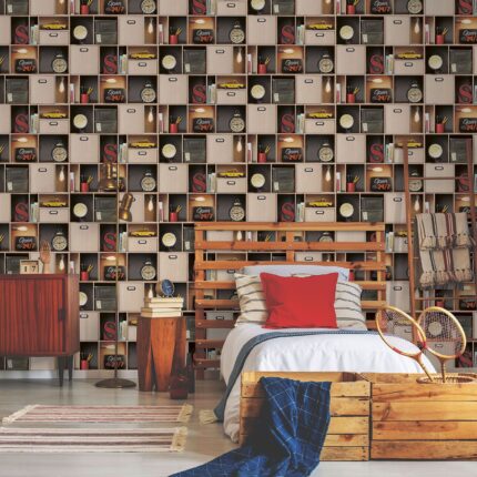 Carta da parato disegno libreria contemporanea per camerette. Supporto in TNT, bambini 6 - 18 anni Consegna 12gg lavorativi