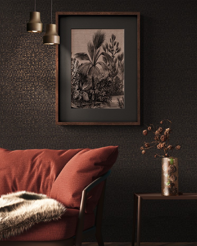 Carta da parato in rilievo con disegno foglie per ambienti contemporanei e classici. Leggermente in rilievo, lavabile con detergenti neutri e resistente agli urti.