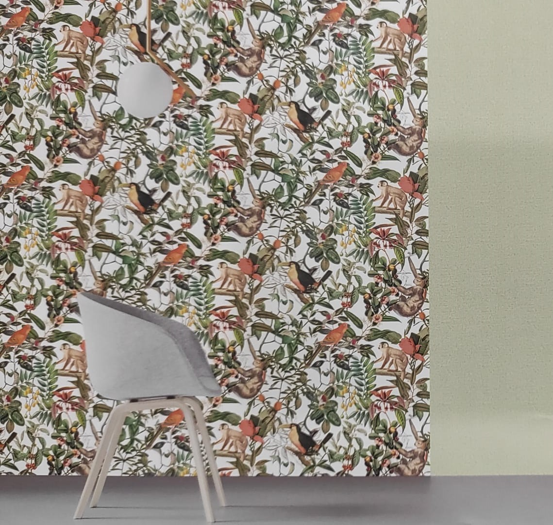 Carta da parato disegno tropicale. Parato vinilico su supporto in TNT. Adatto a camere e soggiorni.
