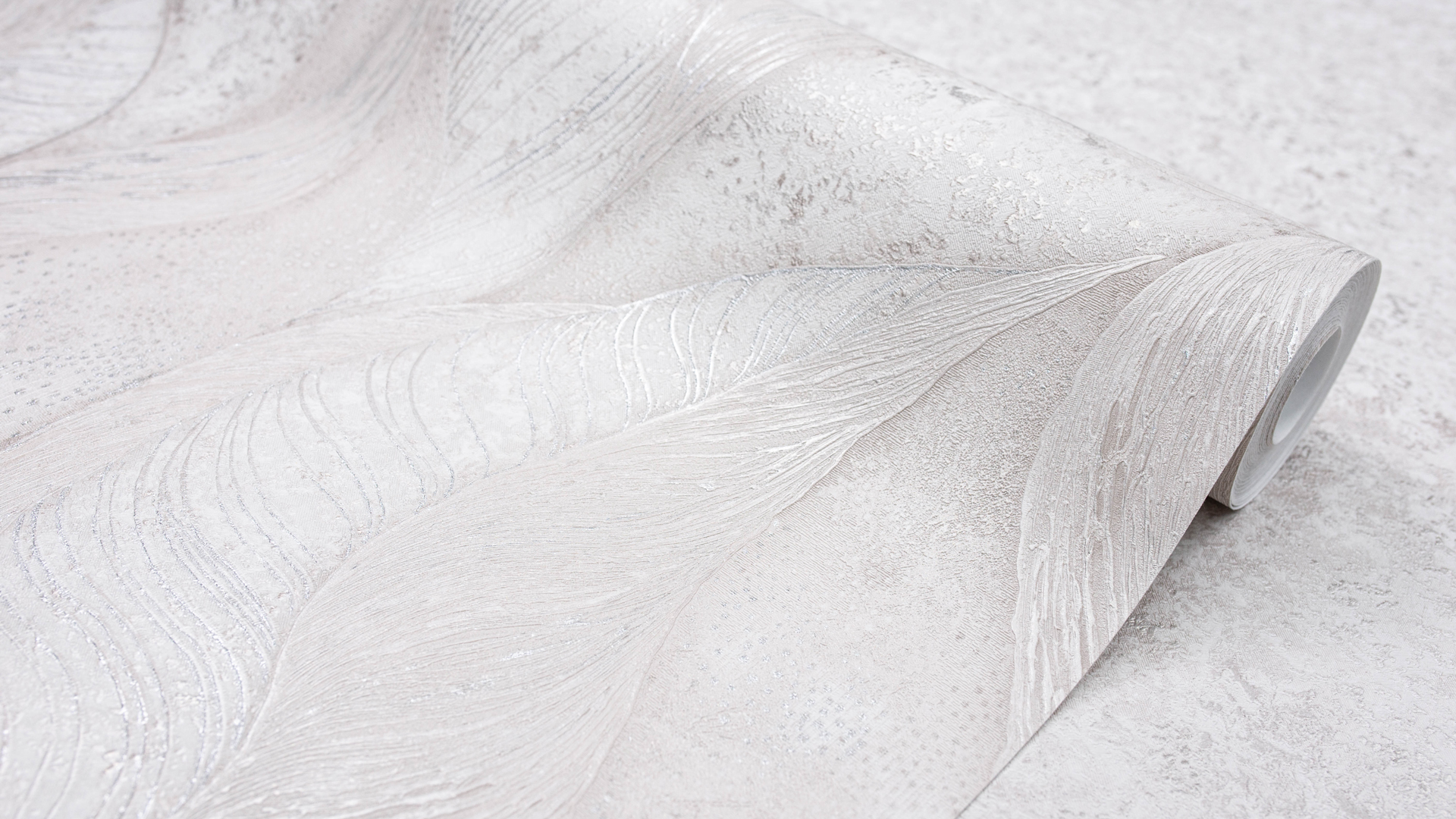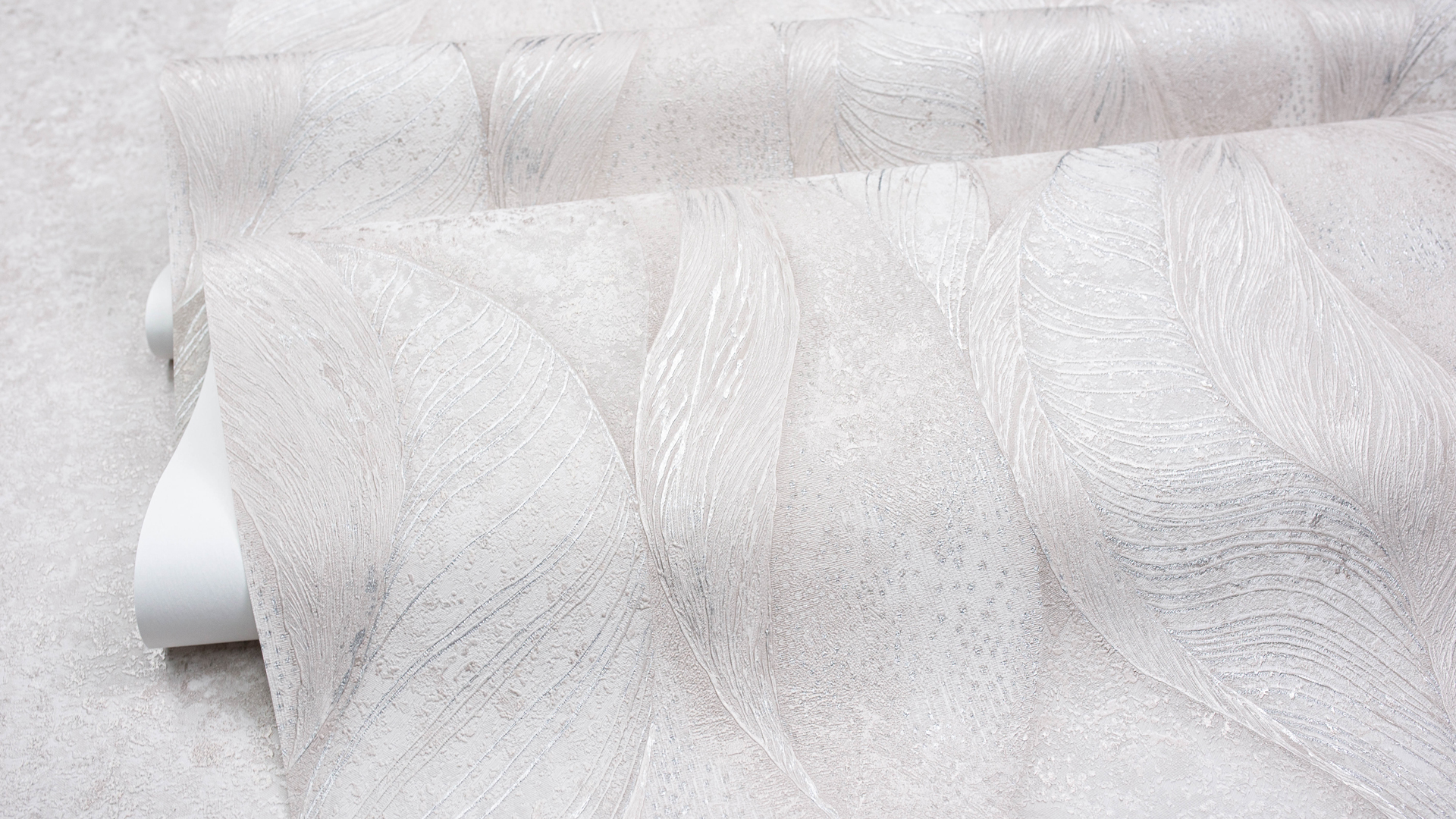 Carta da parato in rilievo con disegno foglie per ambienti contemporanei e classici. Leggermente in rilievo, lavabile con detergenti neutri e resistente agli urti.