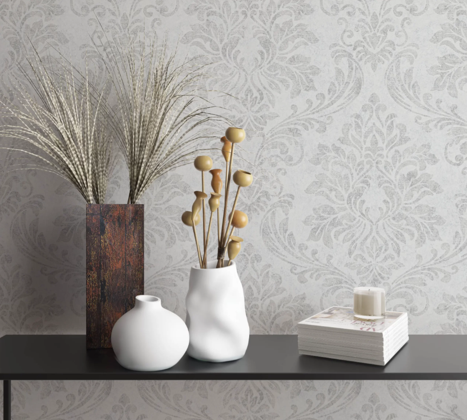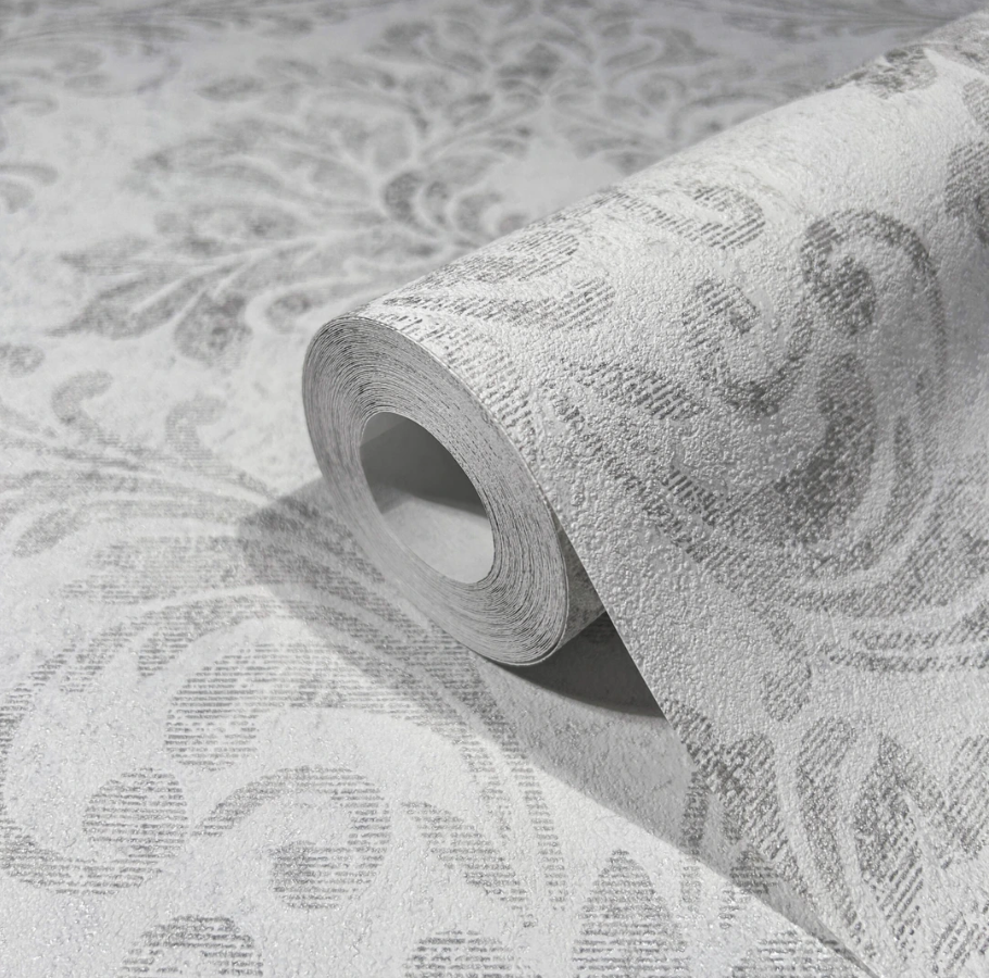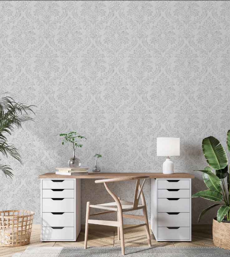 Carta da parato disegno damascato classico. Parato vinilico su supporto in TNT. Adatto a camere e soggiorni.