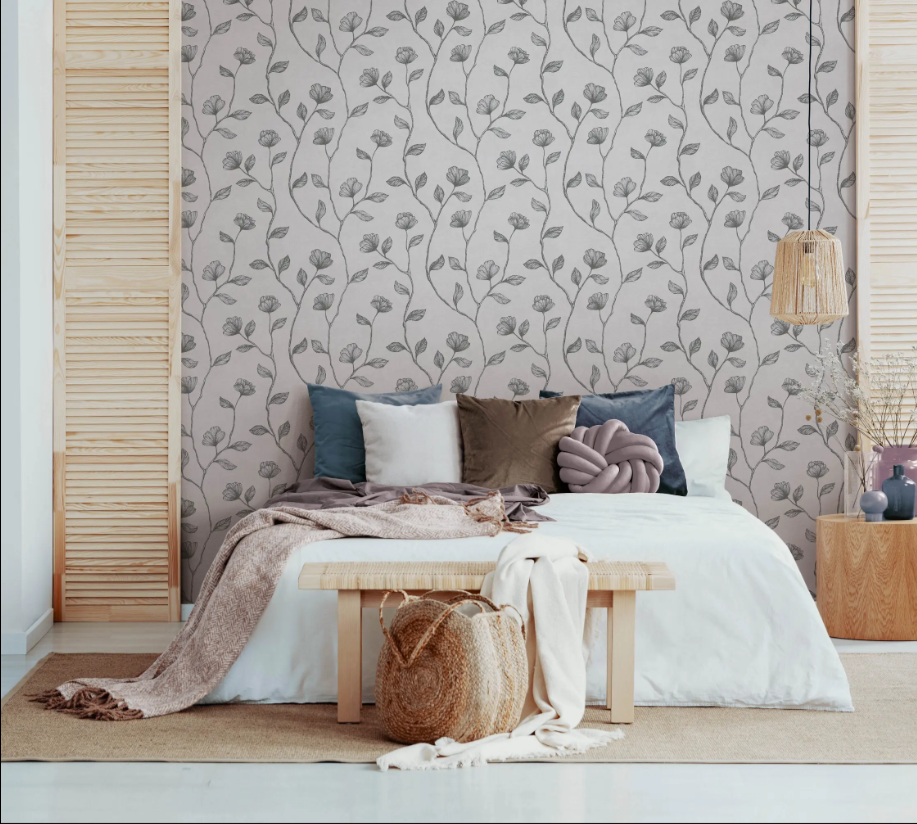Carta da parato floreale in più colorazioni su trama effetto tessuto. Stile contemporaneo e moderno per tutte le tipologie di ambienti.