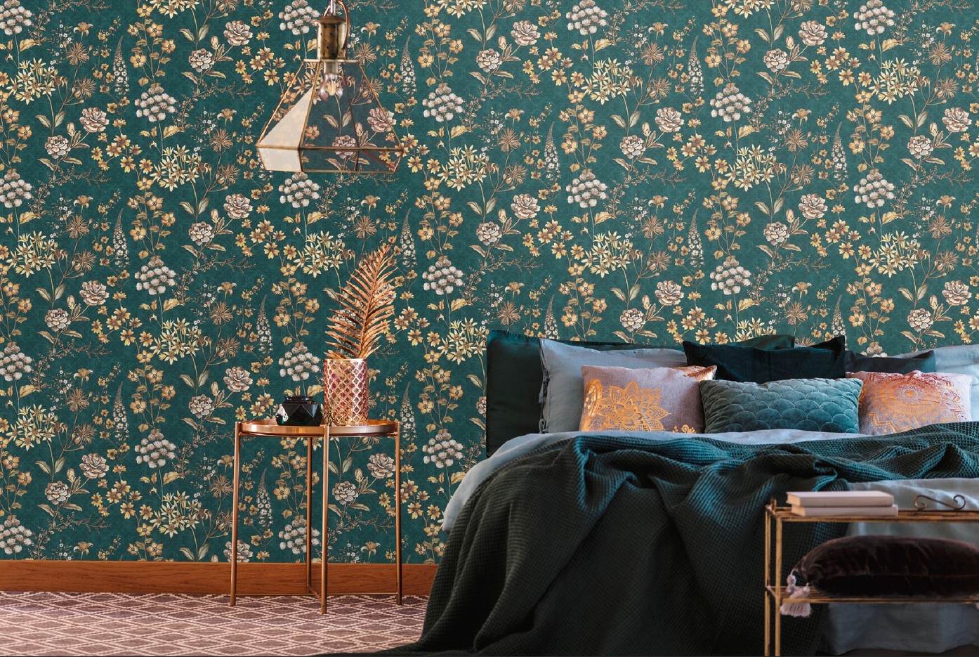 Carta da parato floreale in più colorazioni su trama effetto tessuto. Stile contemporaneo e moderno per tutte le tipologie di ambienti.
