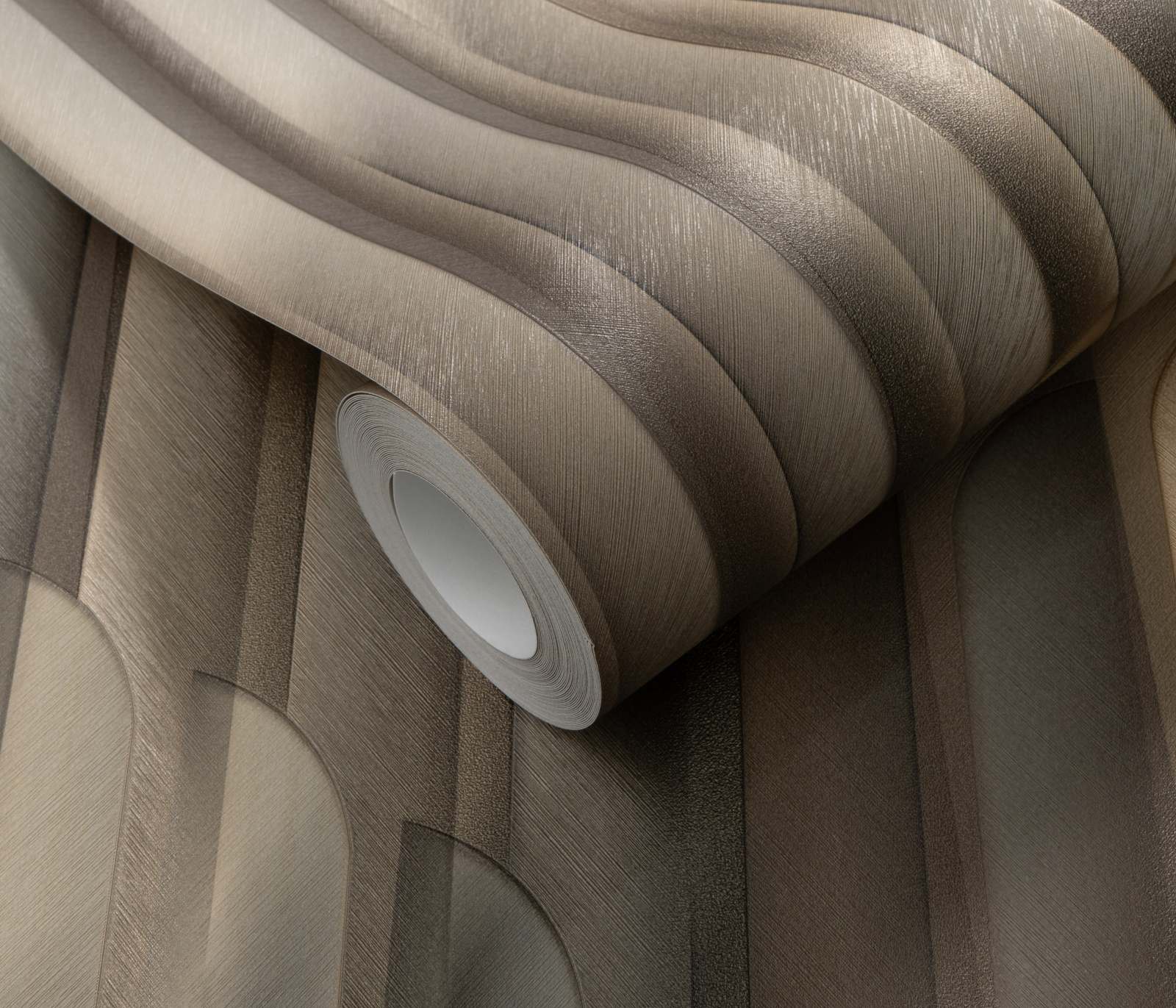 Carta da parato astratto in rilievo brillantinato per ambienti contemporanei e moderni. Leggermente in rilievo, lavabile con detergenti neutri e resistente agli urti.