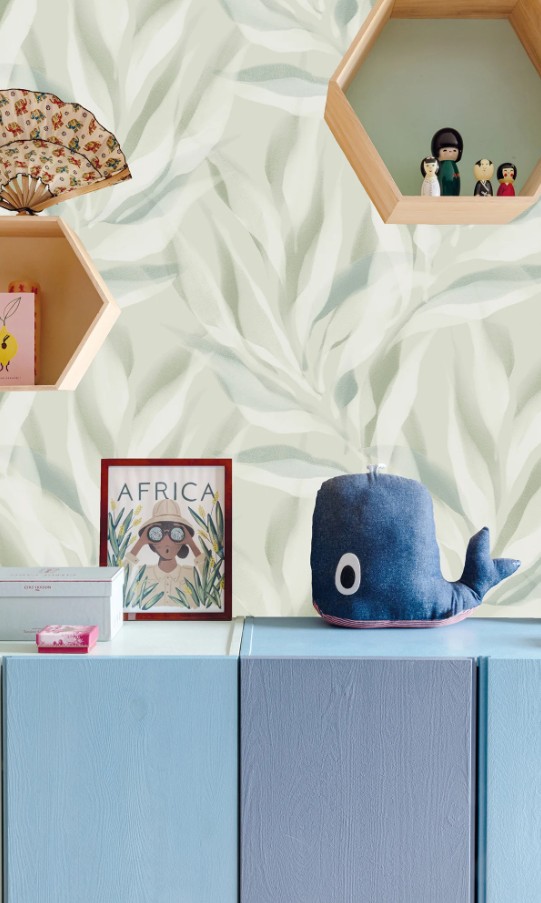 Carta da parato disegno tropicale per ambienti contemporanei e moderni. Leggermente in rilievo, lavabile con detergenti neutri e resistente agli urti.