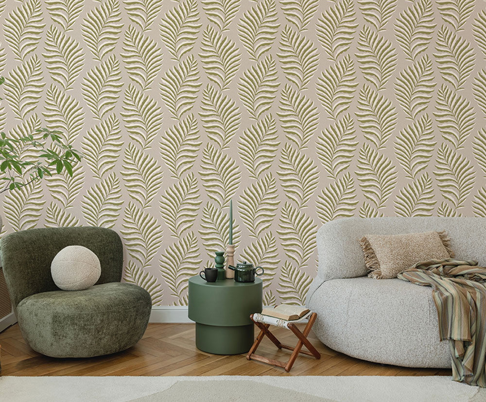 Parato disegno foglie stilizzate in rilievo effetto tessuto. Trama adattabile ad ogni stile.