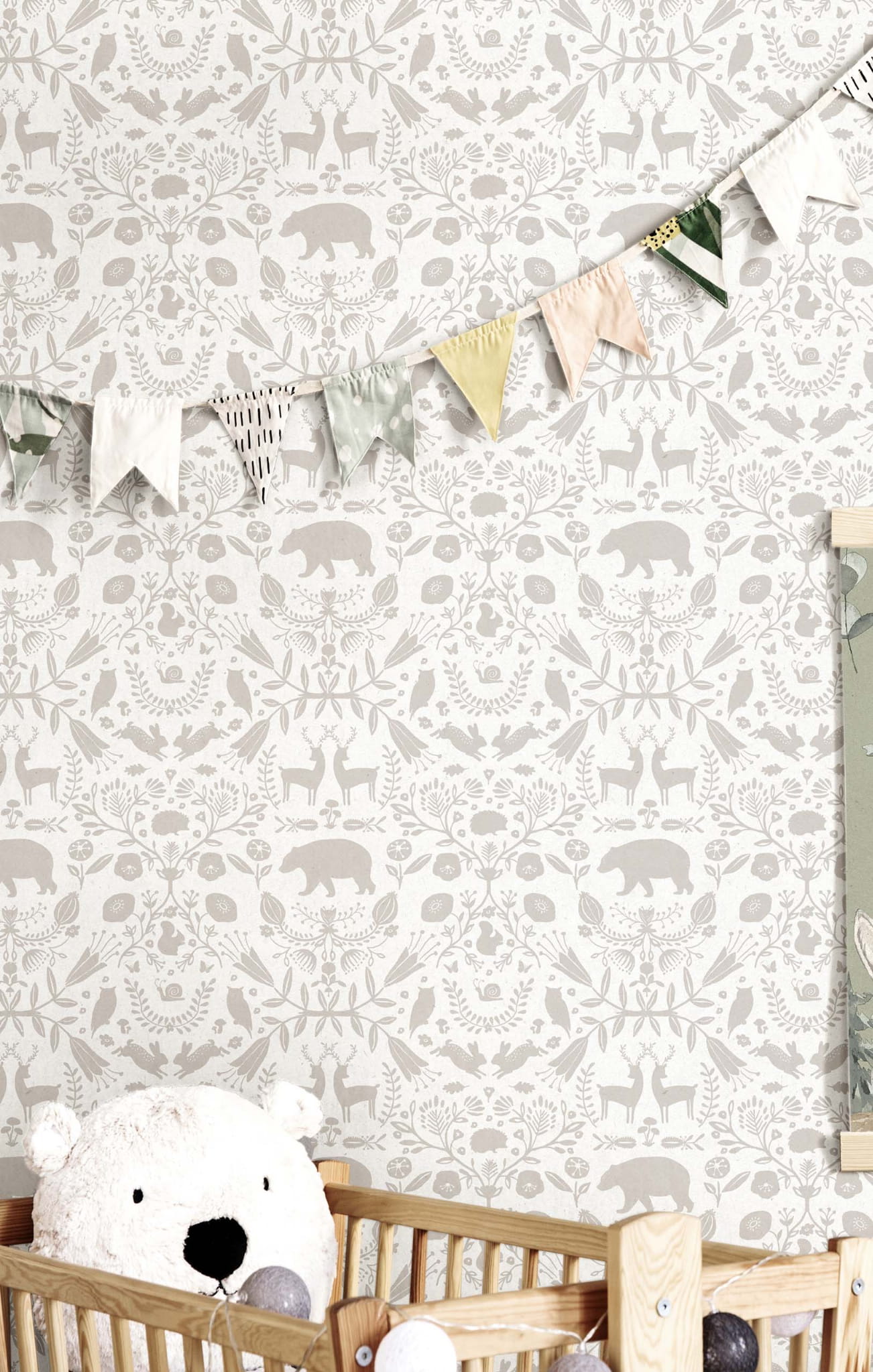 Parato disegno animali del bosco. Trama adattabile ad ogni stile.