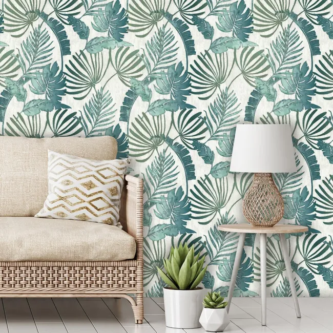 Carta da parato disegno tropicale per ambienti contemporanei e moderni. Leggermente in rilievo, lavabile con detergenti neutri e resistente agli urti.
