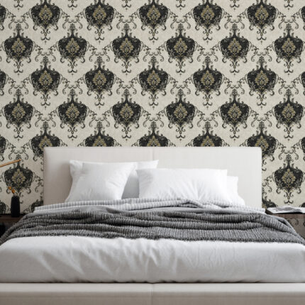 Carta da parato in rilievo brillantinato con disegno damascato per ambienti contemporanei e classici. Leggermente in rilievo, lavabile con detergenti neutri e resistente agli urti.