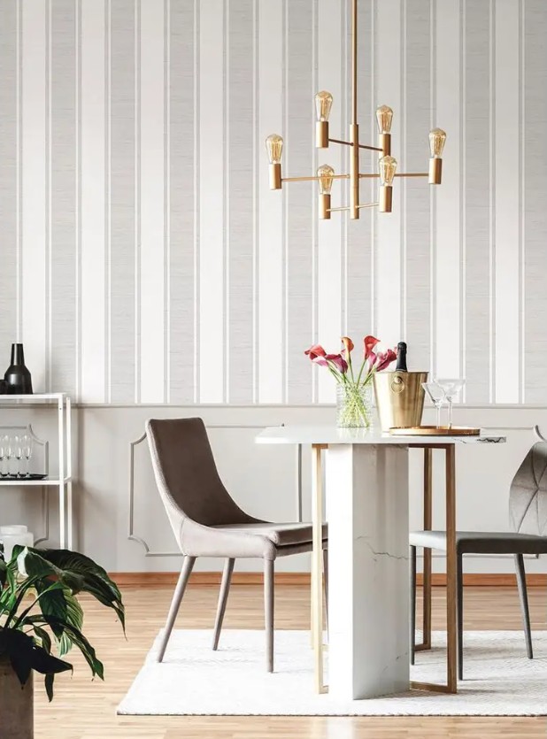Parato disegno rigato classico. Trama in rilievo adattabile ad ogni stile. Lavabile e resistente.