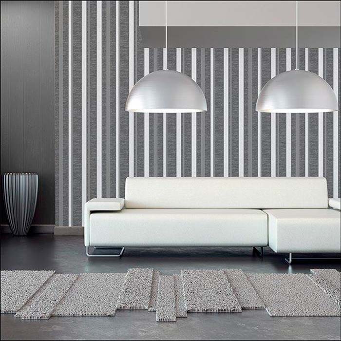 Carta da parato in rilievo con disegno righe per ambienti contemporanei e classici. Leggermente in rilievo, lavabile con detergenti neutri e resistente agli urti.